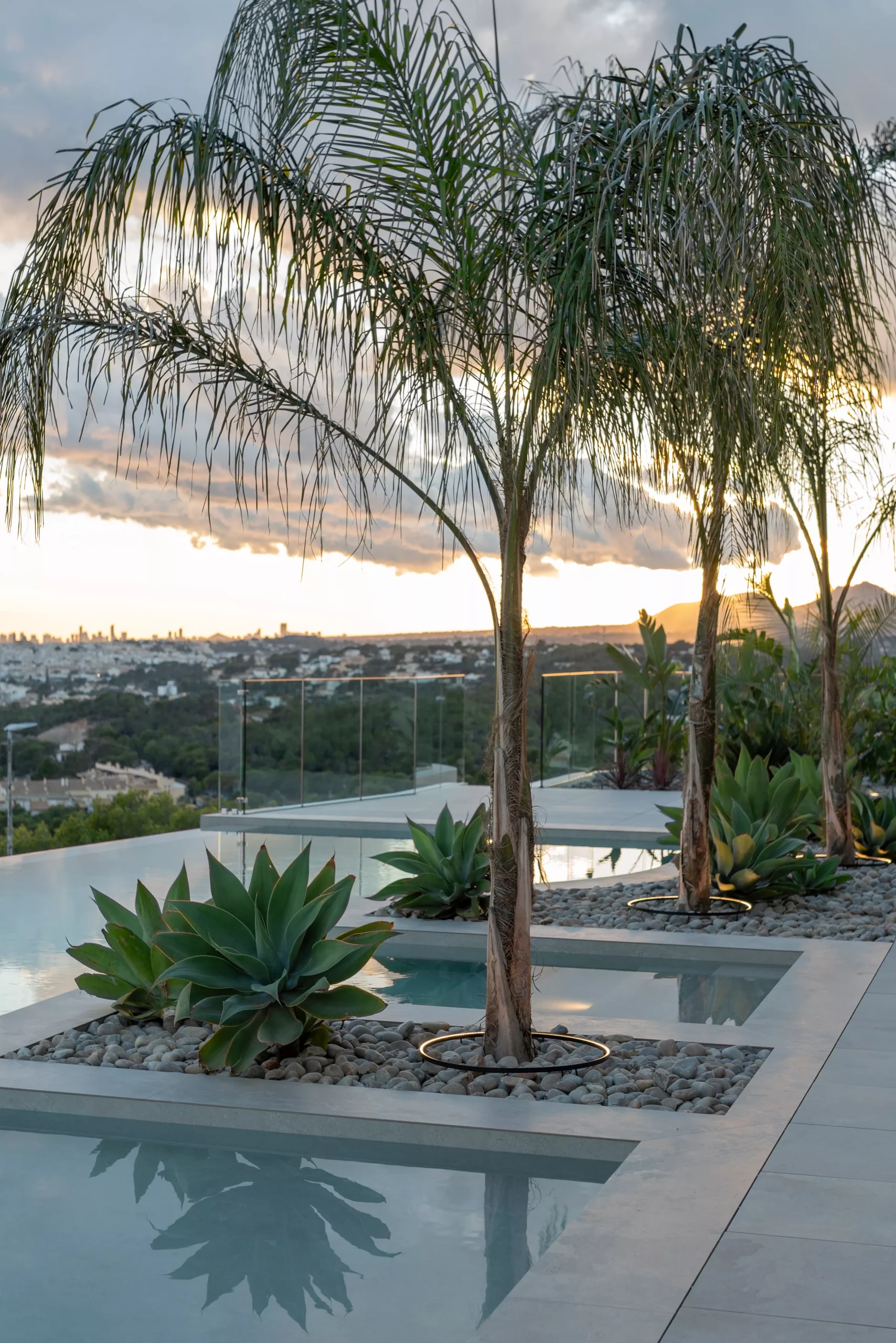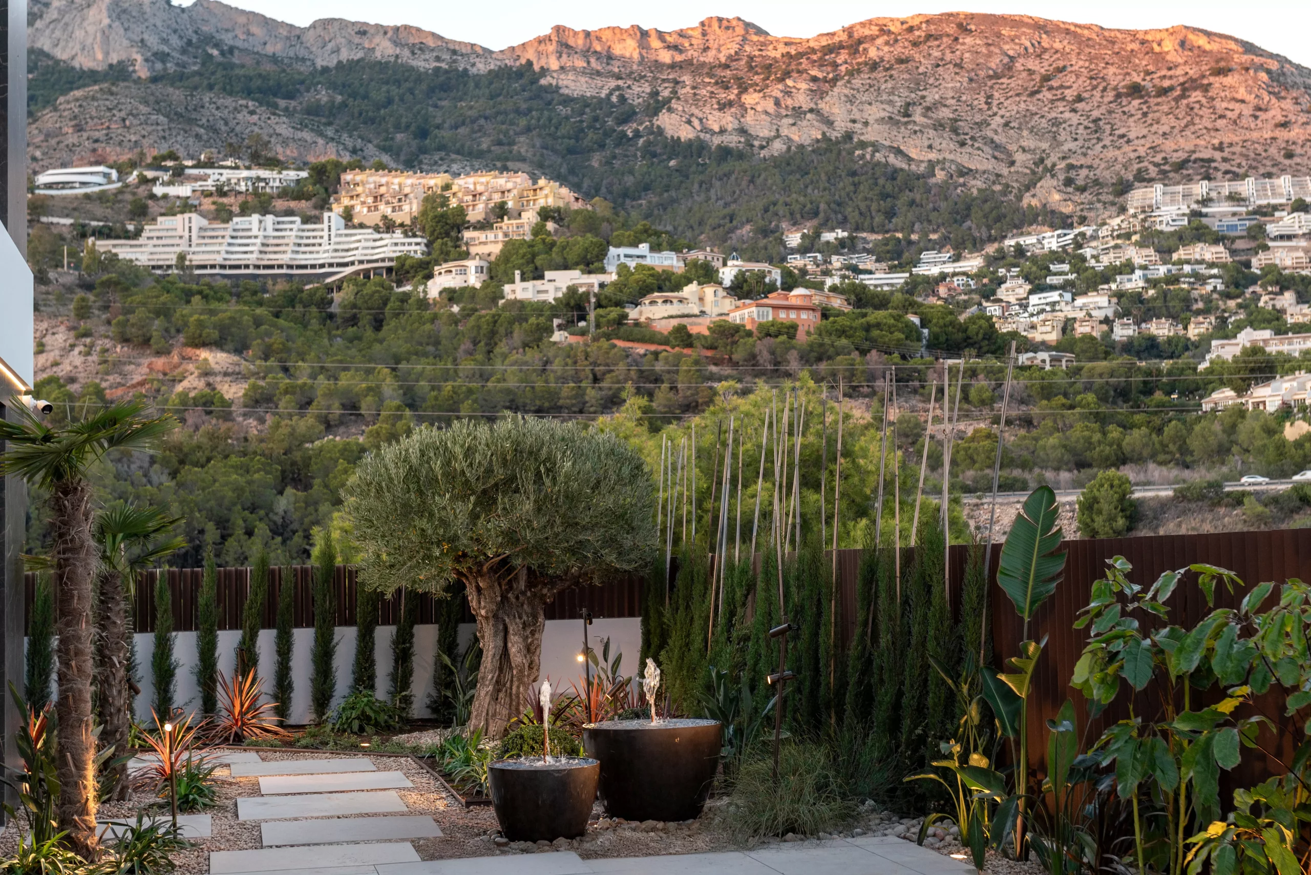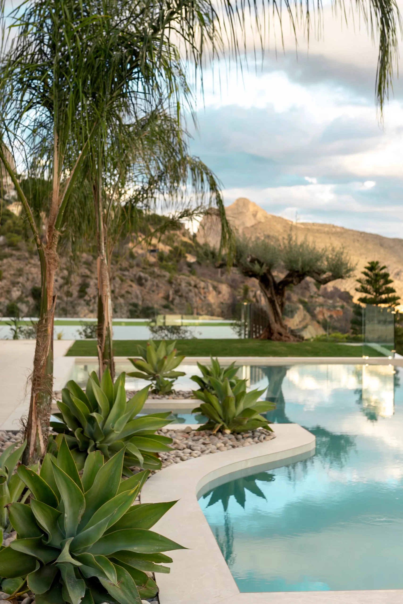 Proyecto paisajístico en Altea inspirado en un estilo mediterráneo contemporáneo con sutiles aires tropicales, concebido para combinar estética, funcionalidad y bajo mantenimiento. El jardín integra diferentes variedades de palmeras, olivos ejemplares y vegetación de porte medio y grande, seleccionando especies resistentes y adaptadas al clima local para garantizar sostenibilidad y durabilidad.