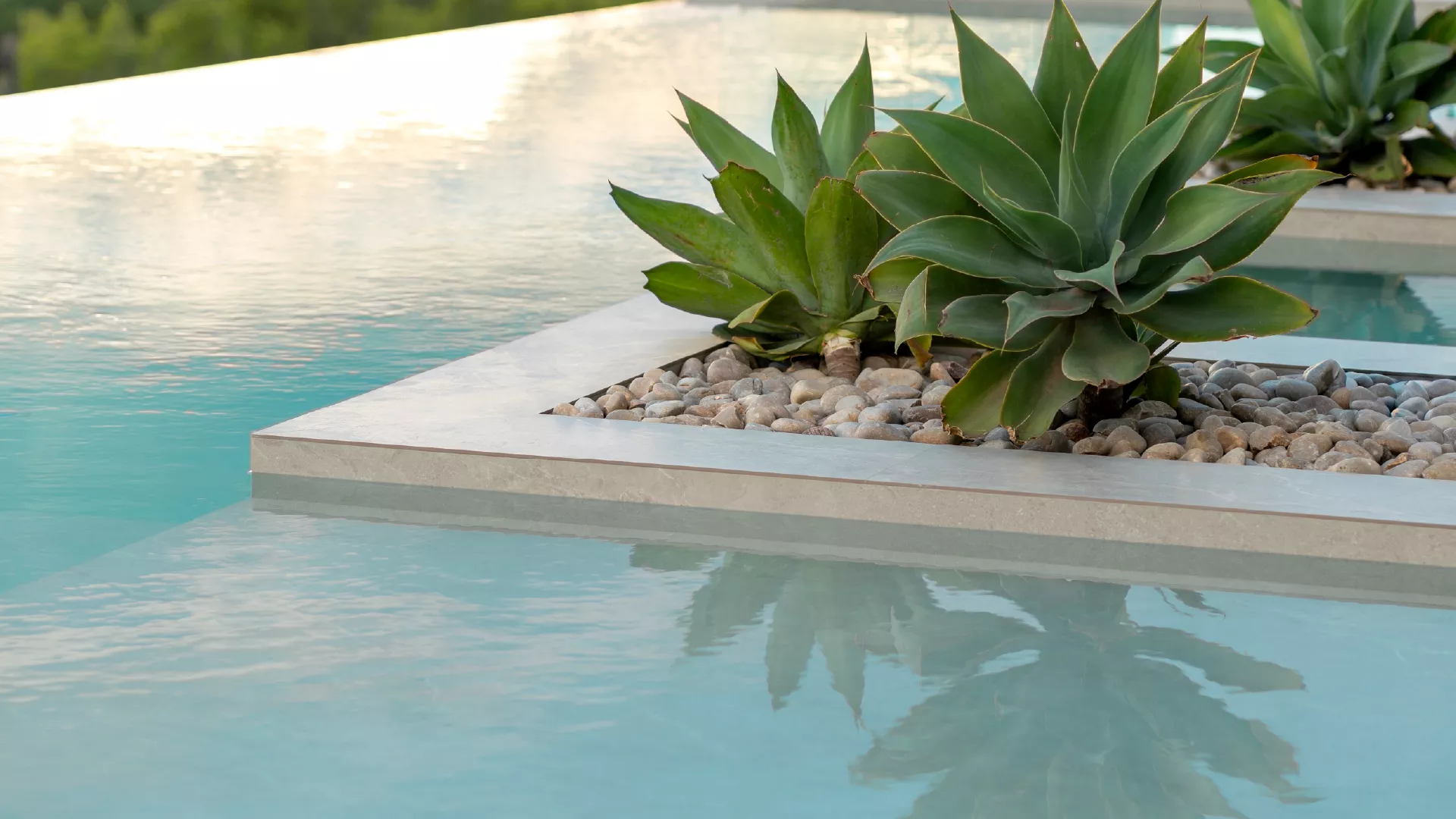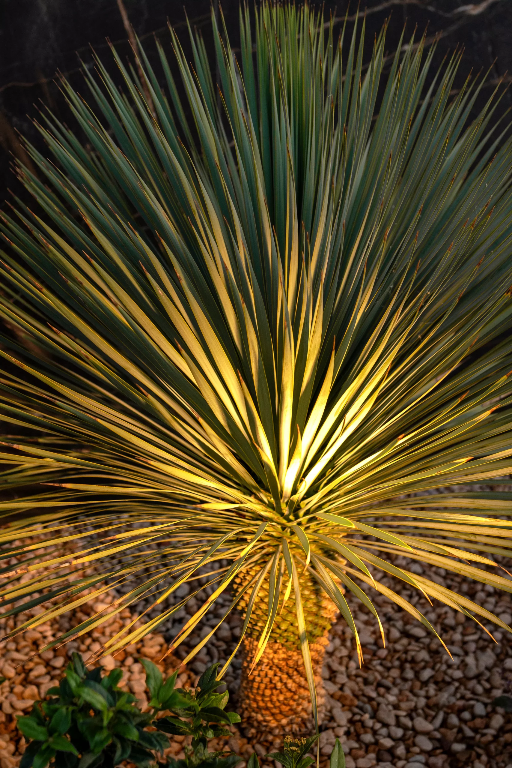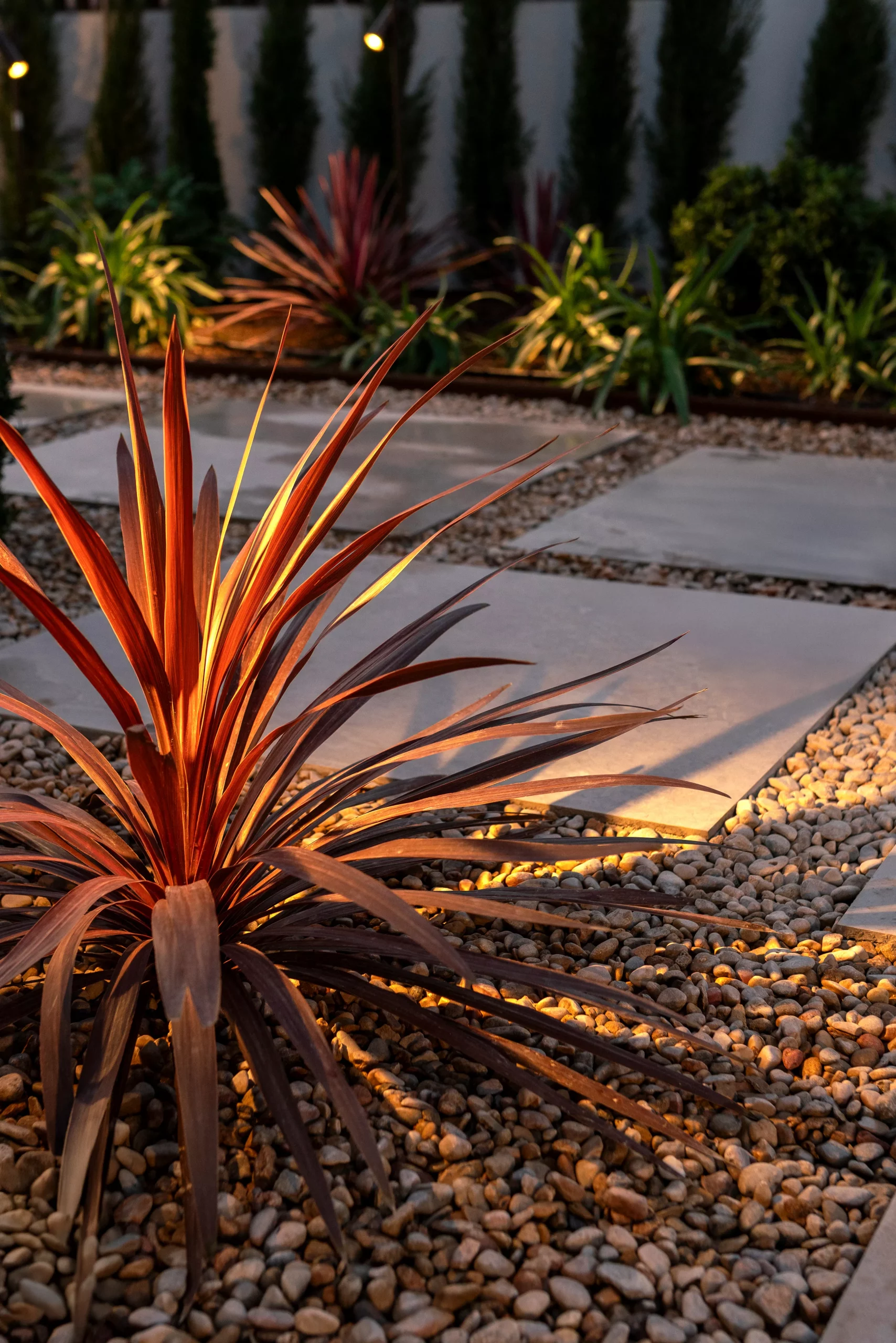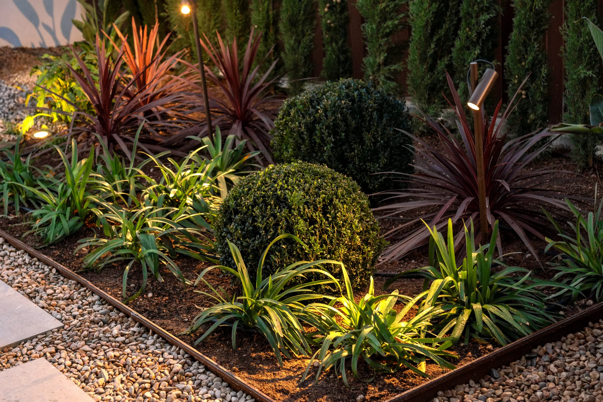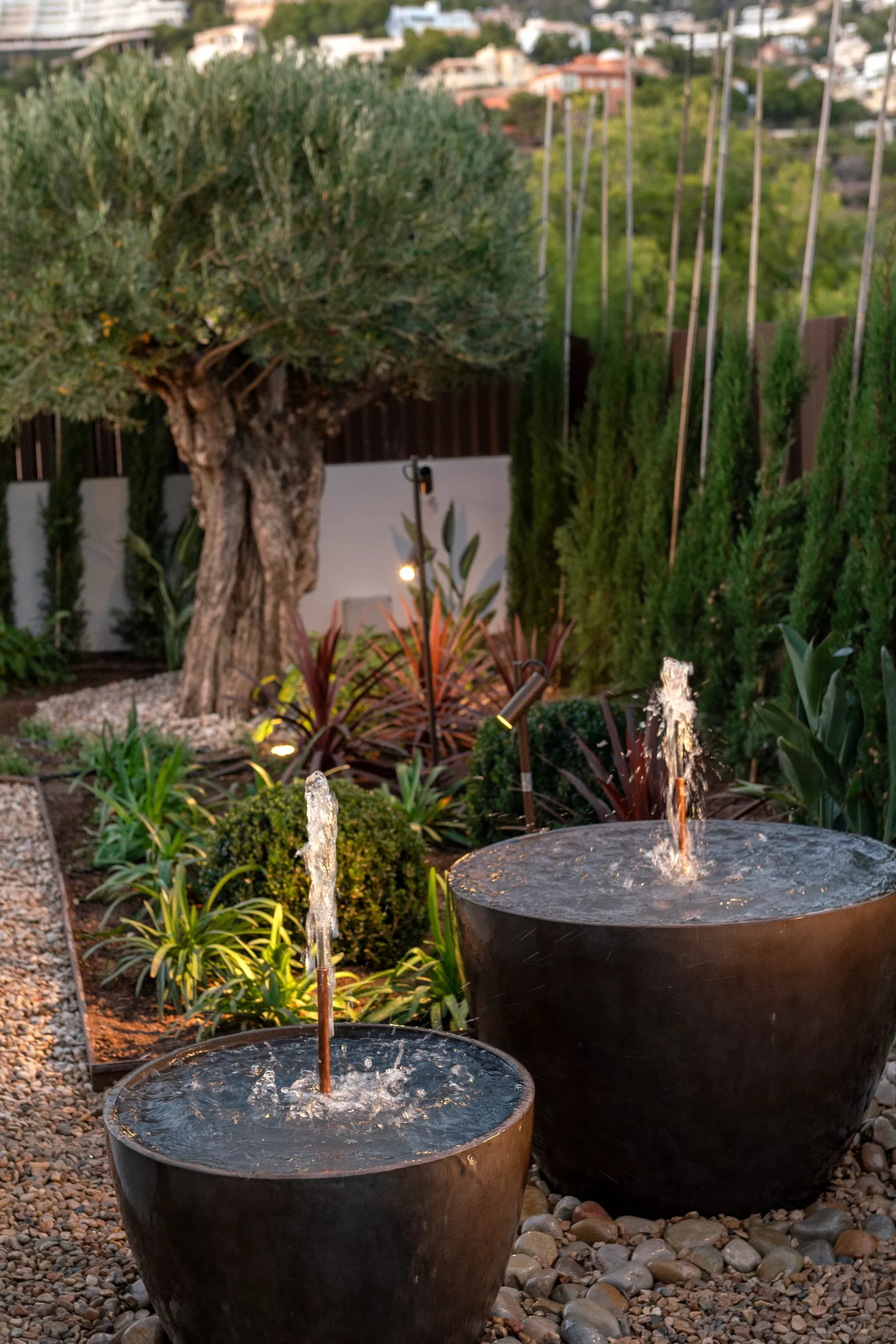 El conjunto presenta un diseño limpio y equilibrado, con formas sencillas y líneas orgánicas que generan una composición natural y armoniosa. Los macizos vegetales, ricos en colores y texturas, aportan dinamismo visual y profundidad al espacio, mientras que las fuentes introducen un sonido relajante que refuerza la sensación de calma. La iluminación juega un papel clave, realzando volúmenes y recorridos para crear una atmósfera mágica y envolvente durante la noche.